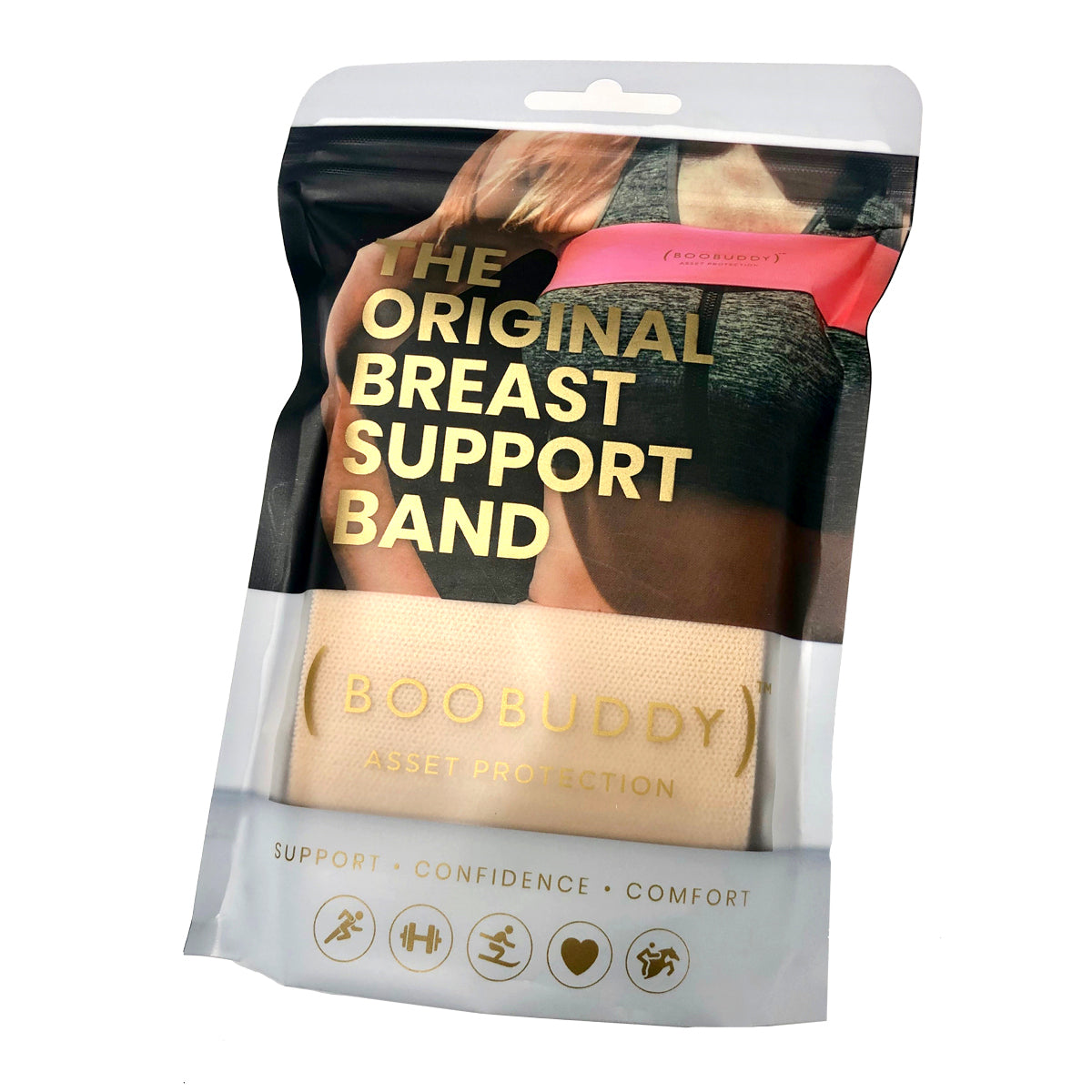 The Boobuddy™ breast support band offers unparalleled support for confident and efficient workouts, runs, and sporting activities. It reduces vertical and lateral breast movement by providing compression tailored for high-impact exercises.